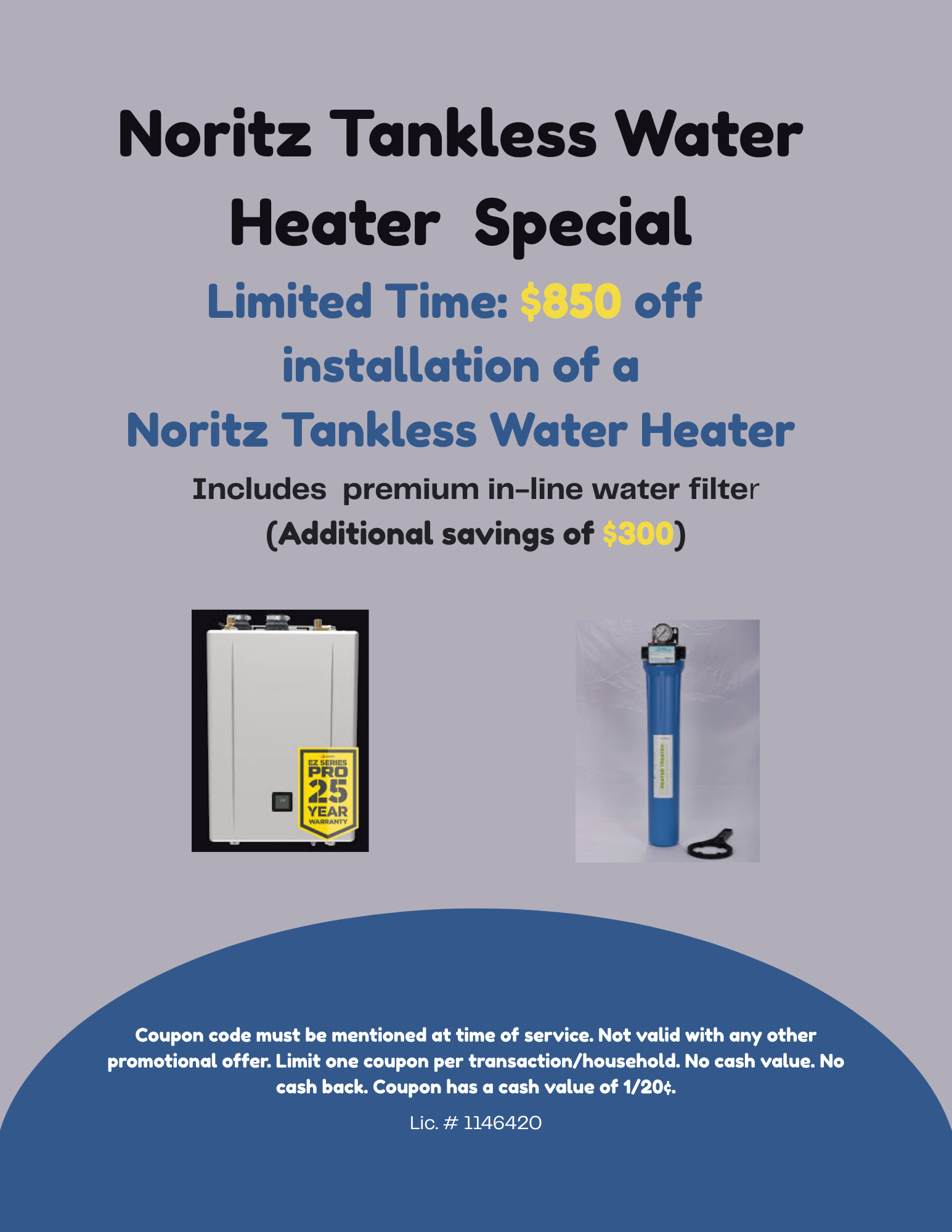 $850 OFF your new Tankless Water Heater installation.